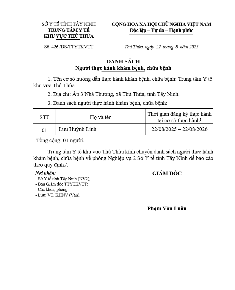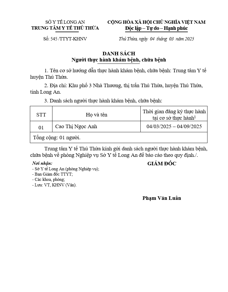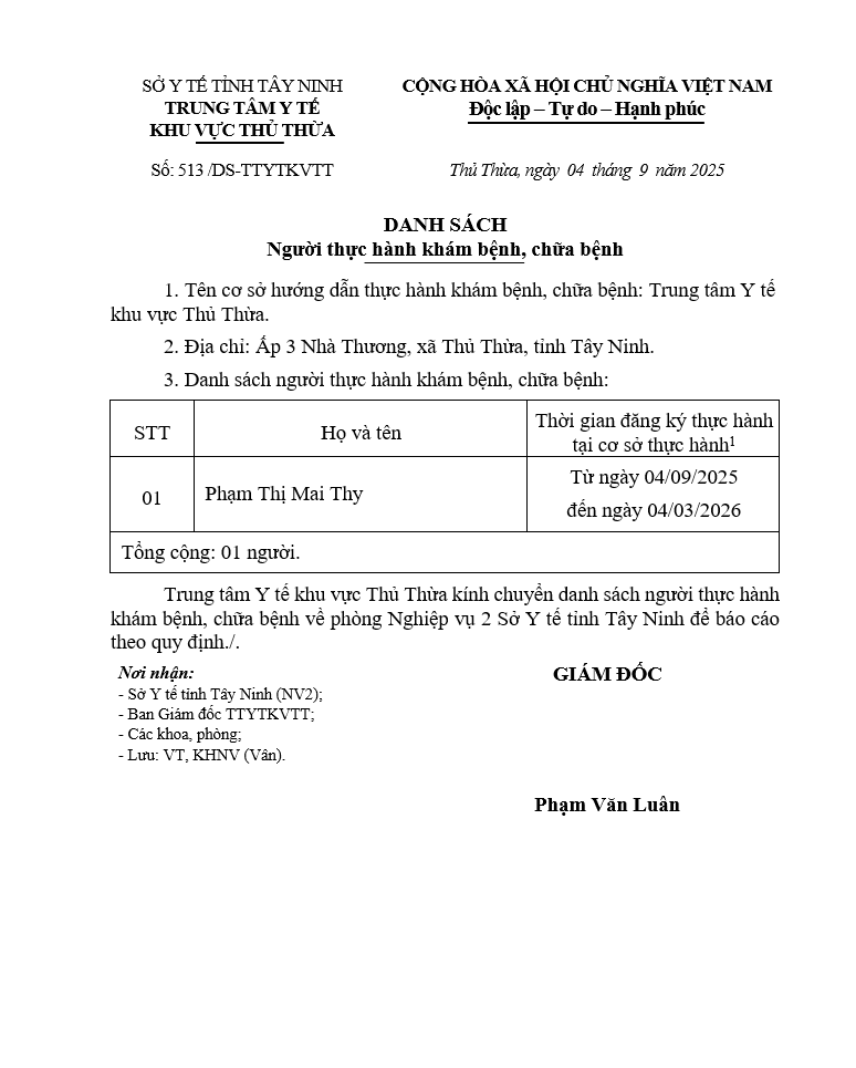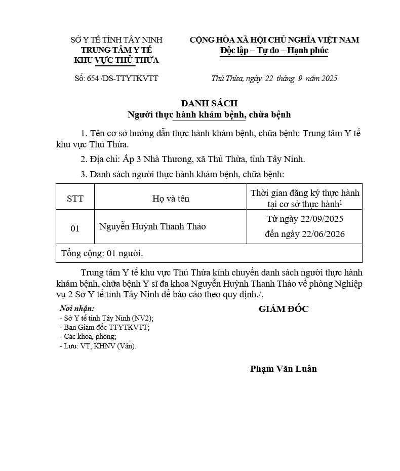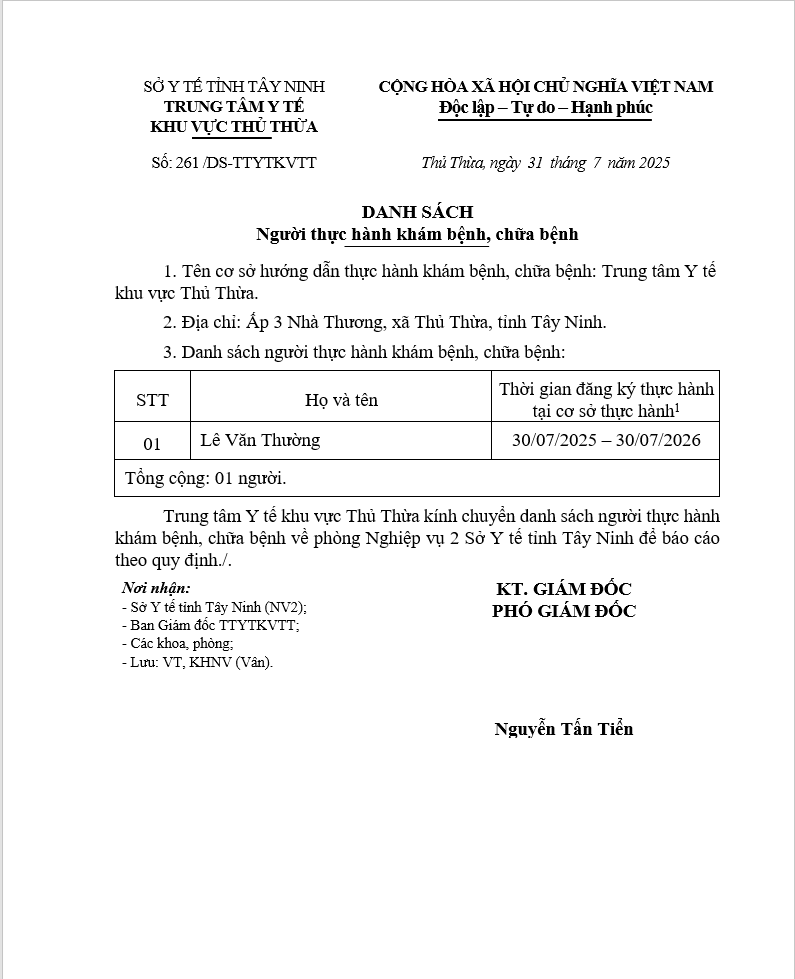 Về việc đăng ký người hành nghề khám bệnh, chữa bệnh tại Trung tâm Y tế khu vực Thủ Thừa - 09/10/2025