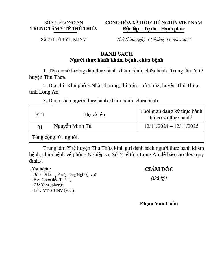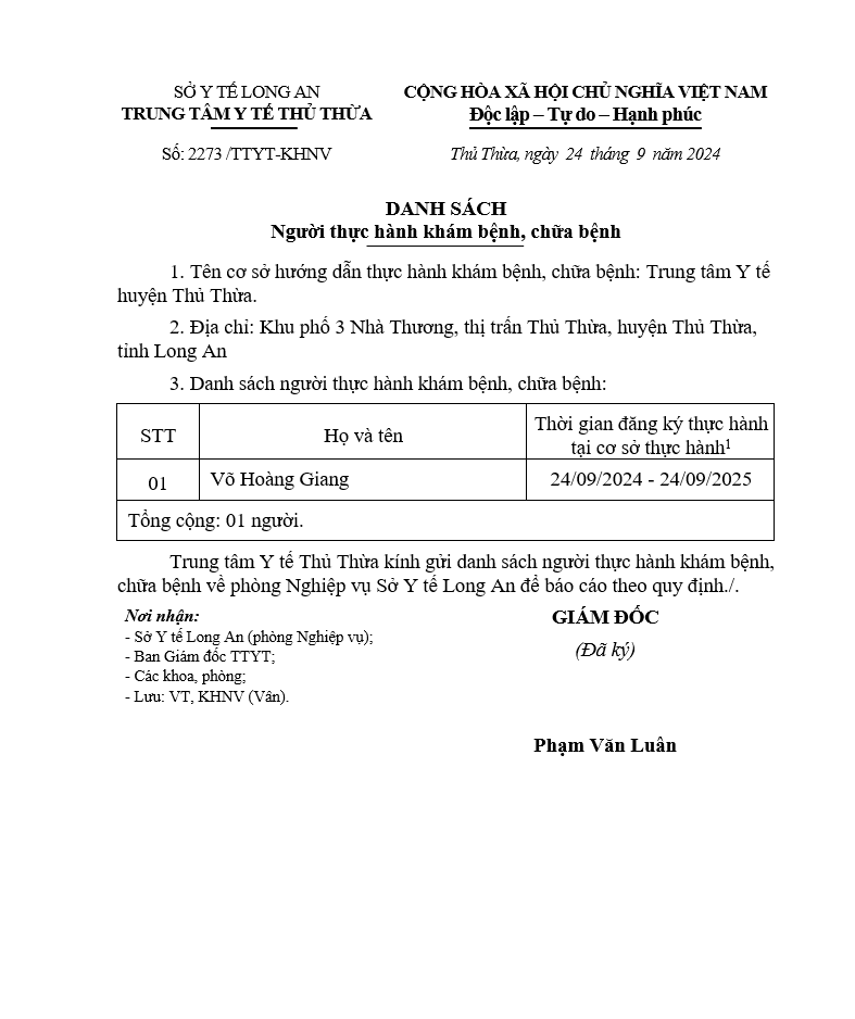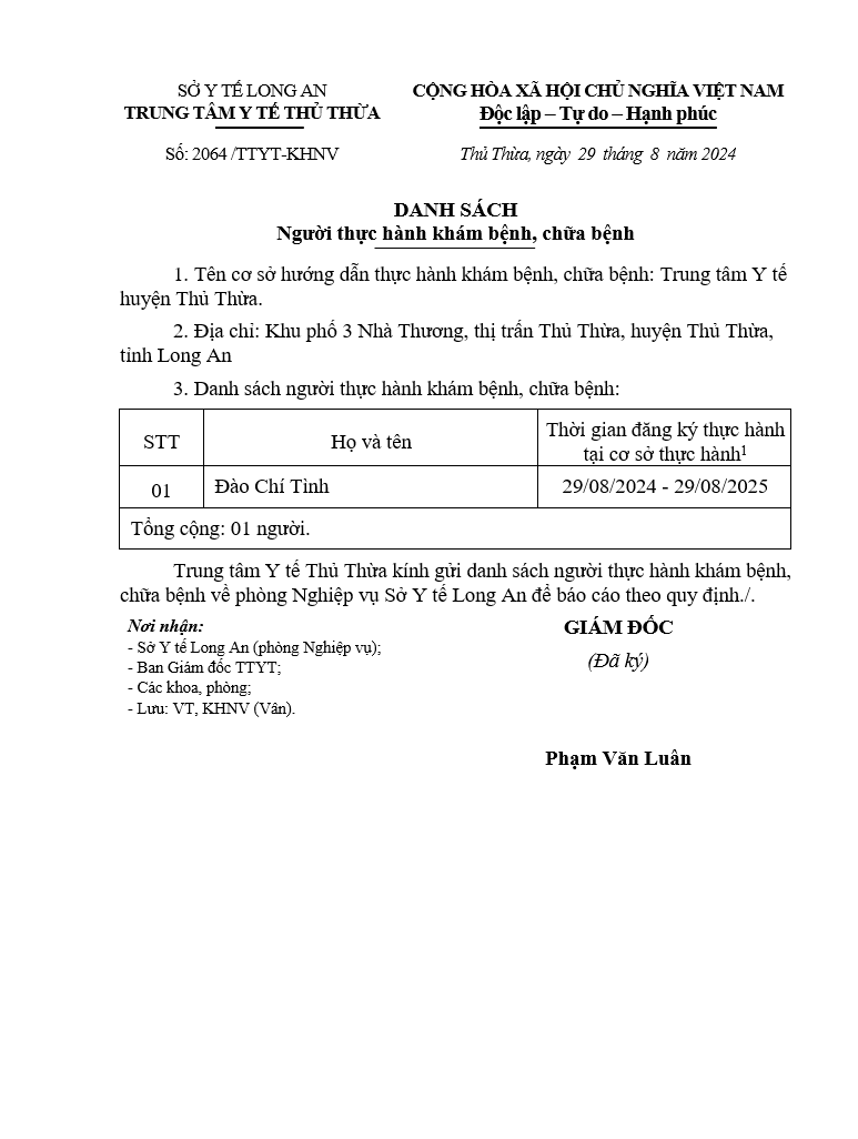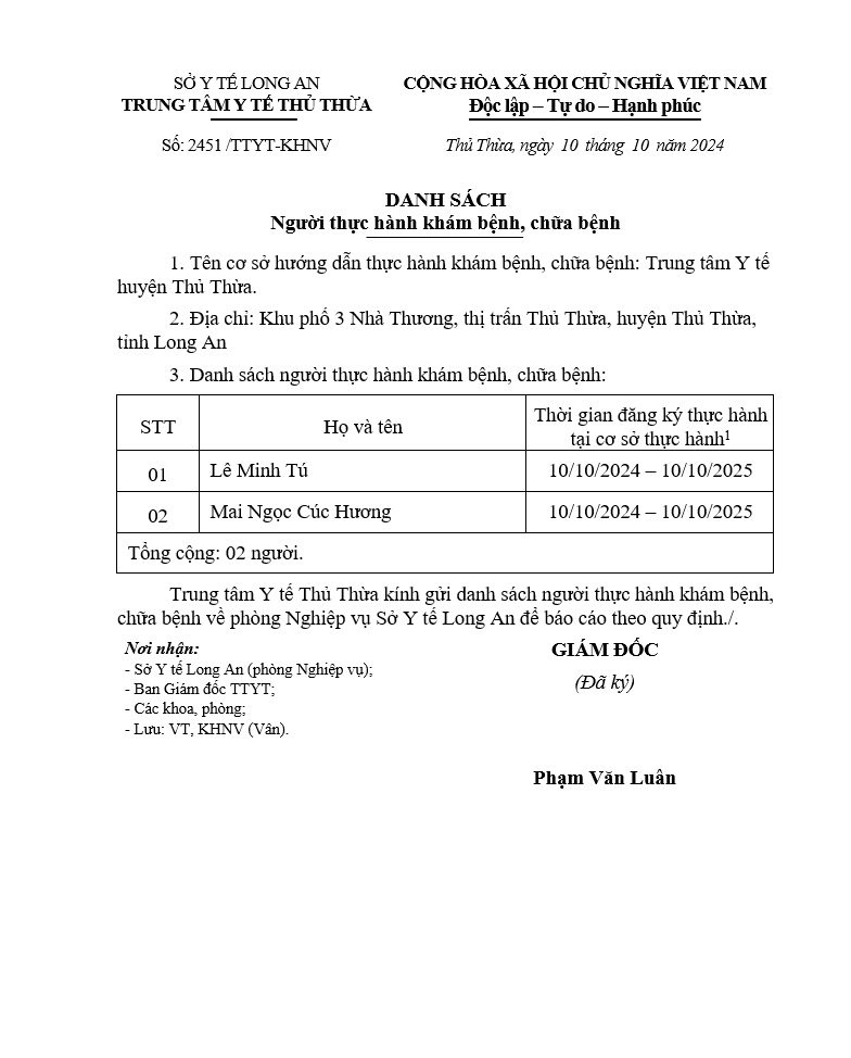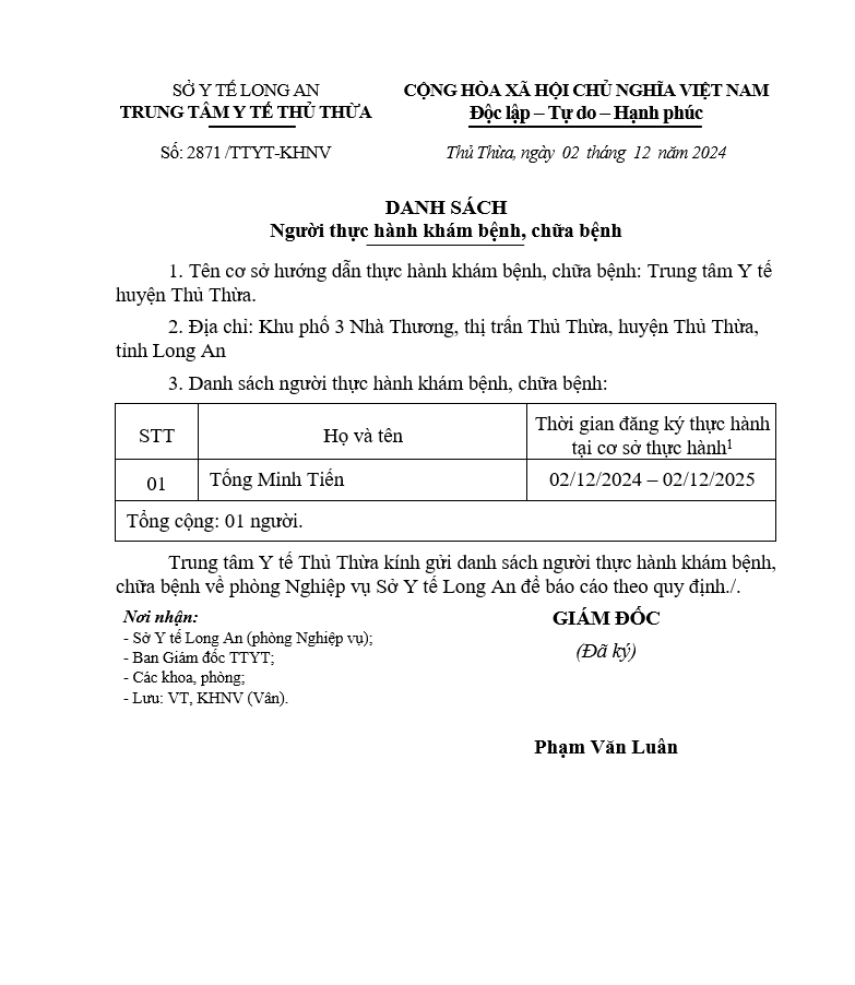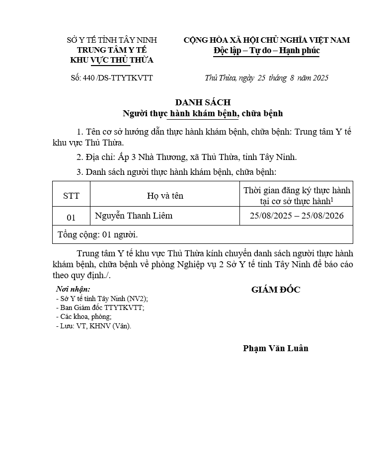 Về việc đăng ký người hành nghề khám bệnh, chữa bệnh tại Trung tâm Y tế khu vực Thủ Thừa - 09/10/2025